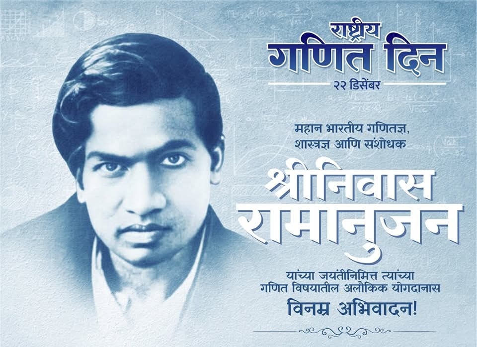 श्रीनिवास रामानुजन यांच्या गणितातील कार्याची महती आपल्या स्मरणात रहावी याकरिता करण्यात येणाऱ्या राष्ट्रीय गणित दिन निमित्त माझ्या सर्व विद्यार्थी विद्यार्थीनी, शिक्षक बांधवांना तसेच गणितज्ञ, वैज्ञानिक व शास्त्रज्ञांना राष्ट्रीय गणित दिनाच्या हार्दिक शुभेच्छा